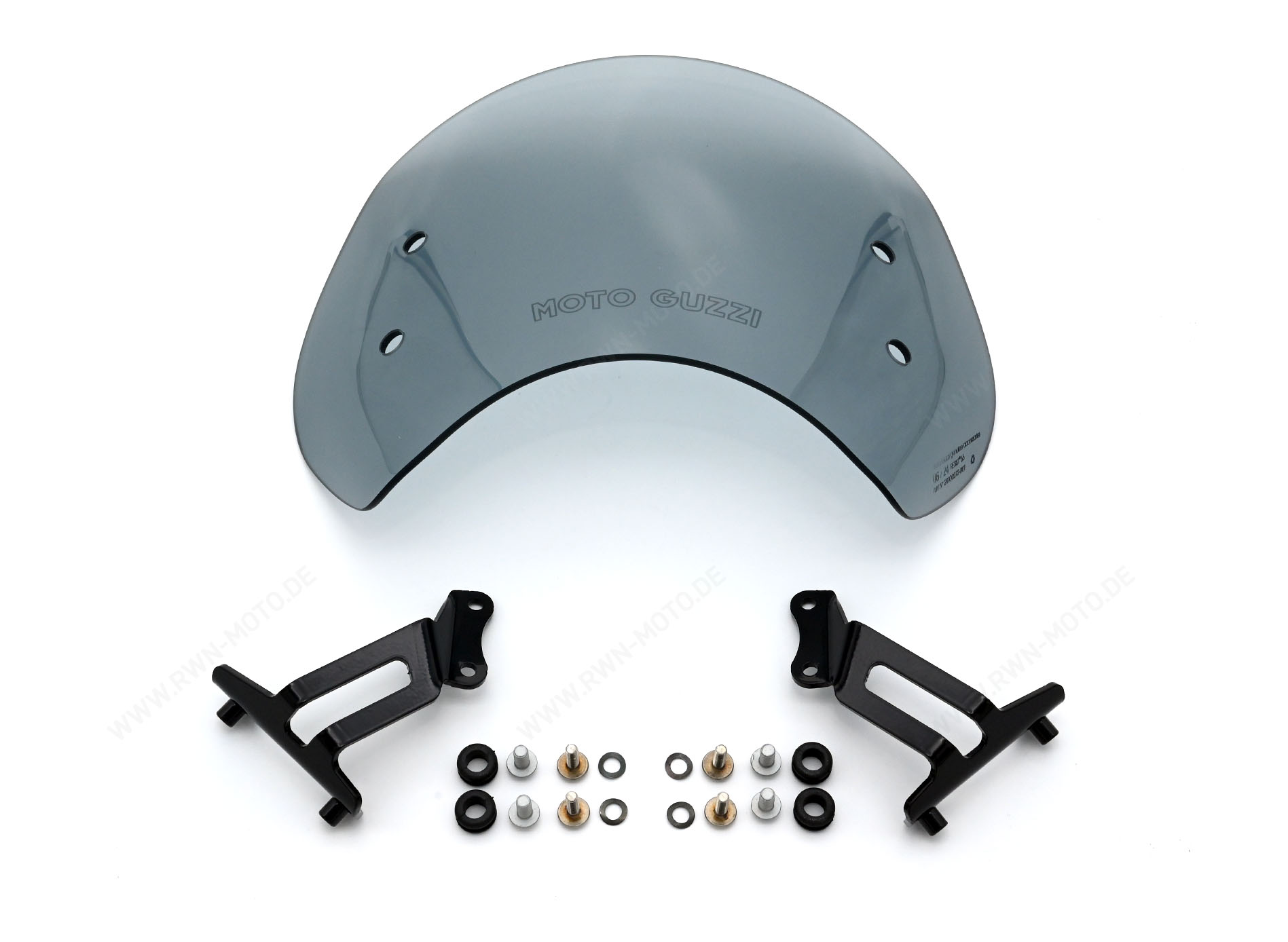 - Pequeño parabrisas de tintado oscuro y diseño deportivo con el logotipo de Moto Guzzi. Mejora la aerodinámica. Incluye soporte.